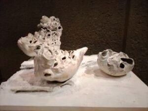 陶土は野焼き直火焼き焼成し、破裂したものを再形成しながら構成しています。