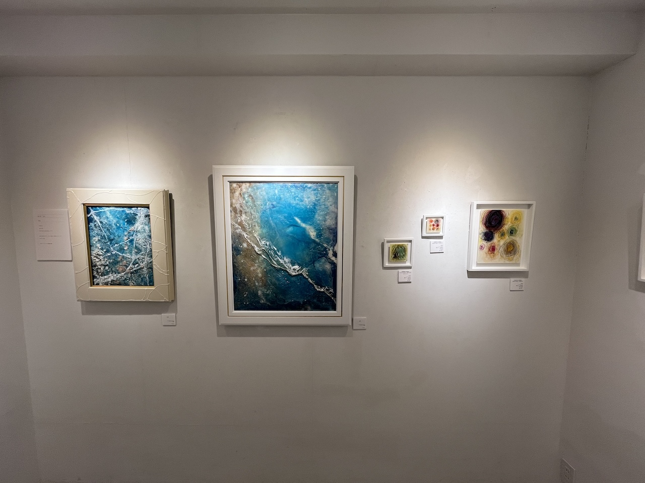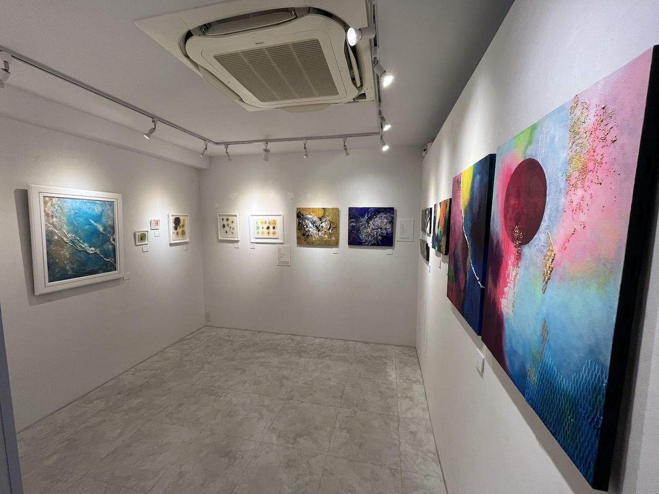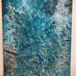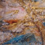 インク、墨、アクリル、レジンに加え、クリスタルパウダー等も画材として用い、感覚的な表現を探求。作品には、過去から現在へと続く時間の流れや承認、誰の内側にもある静かな「空(くう)」の領域の気づき、今この瞬間が生きることのピークであることを表現する。