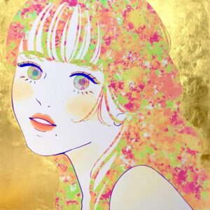 海外で撮影した花々と女性を融合させた作品本金箔を用いて人物の内面美を