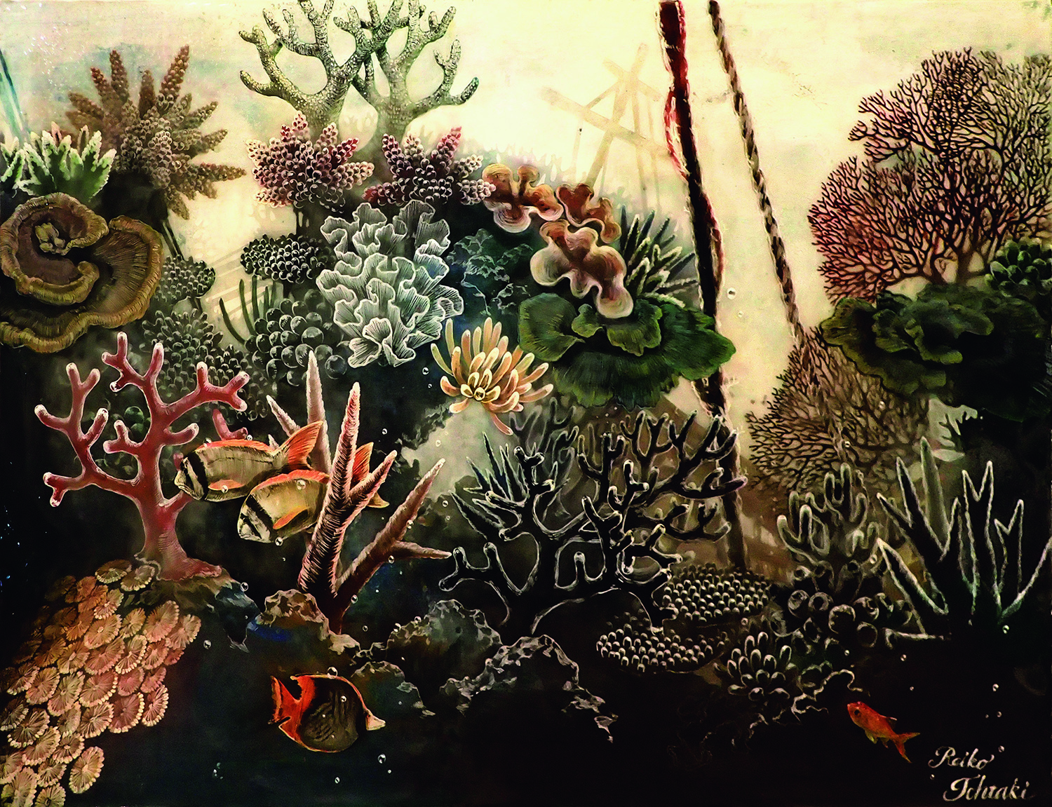 海洋は、地球上でもっとも広く重要な生態系を持つ環境だ。その中でも、サンゴ礁の生態系は群を抜いて多様性に満ちている。密集する生き物たちはまるで一つの大きな生物のように見えることもあれば、賑やかで残酷な都市のような姿を見せる。日の光を、栄養を奪い合いながら、生きる彼らは壮大な風景を作る一方、その姿は体の深層に隠された内臓にも似ている。皮膚の中と水の中、共に我々にとって日常生活で触れることのない、境界を隔てた世界だ。しかしそこには、形態の類似にとどまらず、秘められたリズムが共鳴している。我々の内部には、我々の知らない自然が蠢いている。