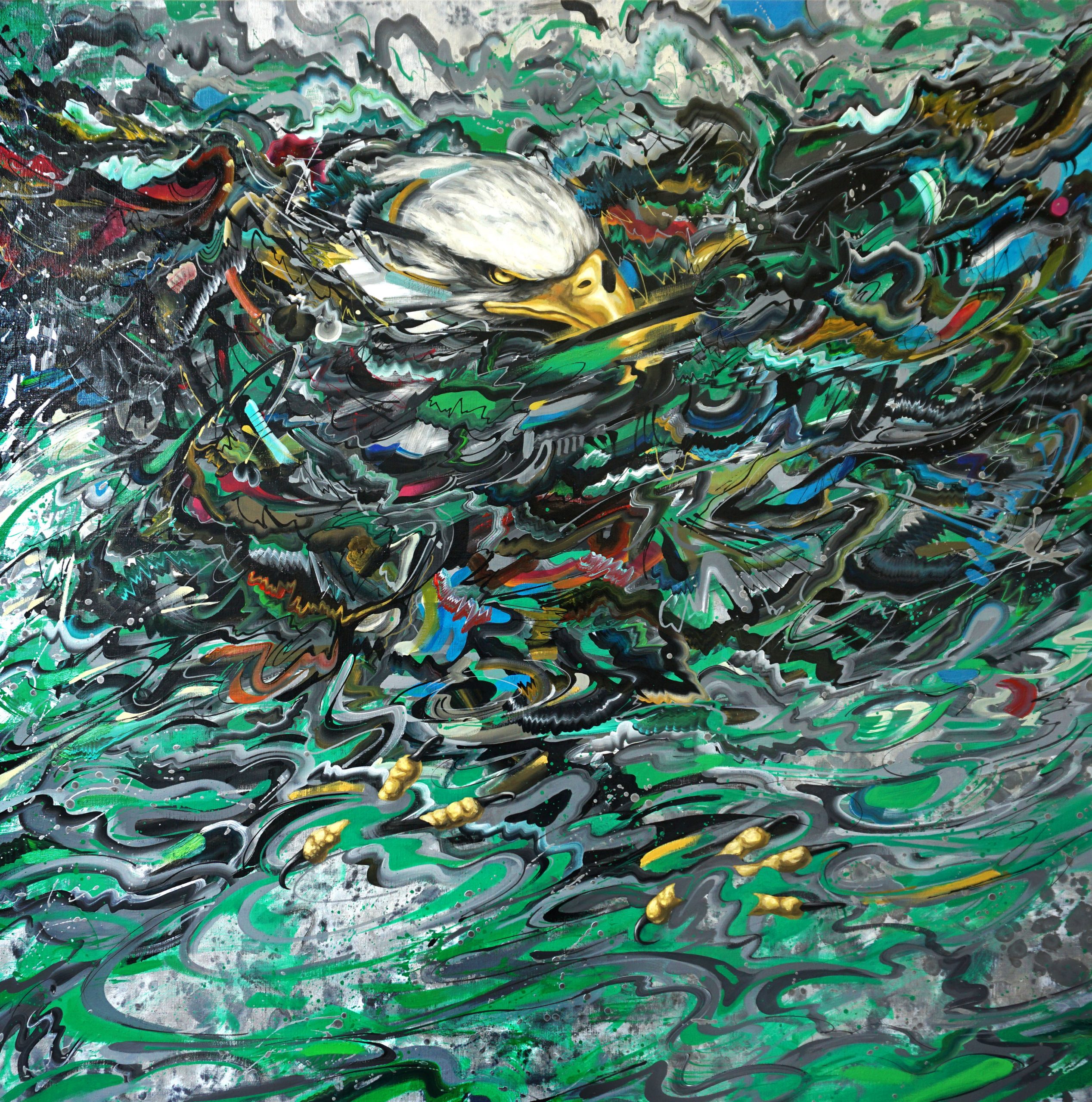 こういった問題を表現する上で、私は自身の大きな身体感の伴う筆勢の集積、ドリッピングという手法に加え、偶然性の伴うたらしこみやエアブラシといった様々な手法を取り入れながら、対象物を融合・変容・解体させて描いています。