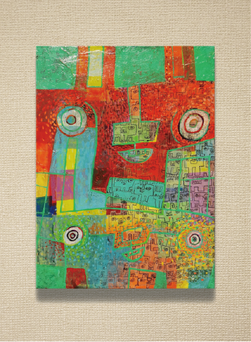 人のために作る「デザイン」と自己表現の「アート」を融合させ、視線の誘導や色使いなど、グラフィックデザイナーとしての経験を生かした絵を描いています。