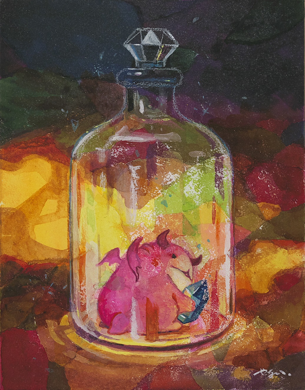 手法はコラージュ、さらにコラージュに透明水彩や色鉛筆で着彩