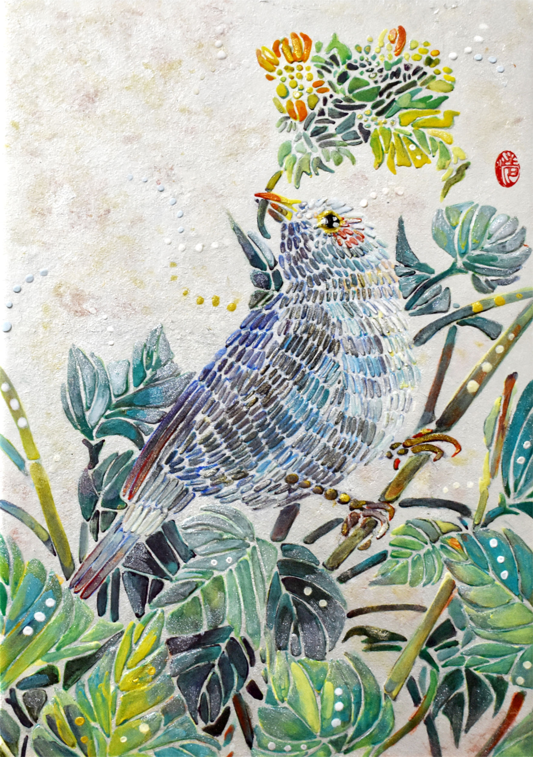 常識にとらわれない様々な素材のマチエール(トイレットペーパーなど)を大胆に下地に使い、いきものの力強さ、美しさを描く。