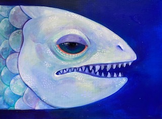 また、近年はオイルとアクリル絵の具を混ぜ合わせて出来る偶然の作り出す模様の美しさに魅せられ、その中から“いきもの”を見つけ描きだす作品を多数制作。
