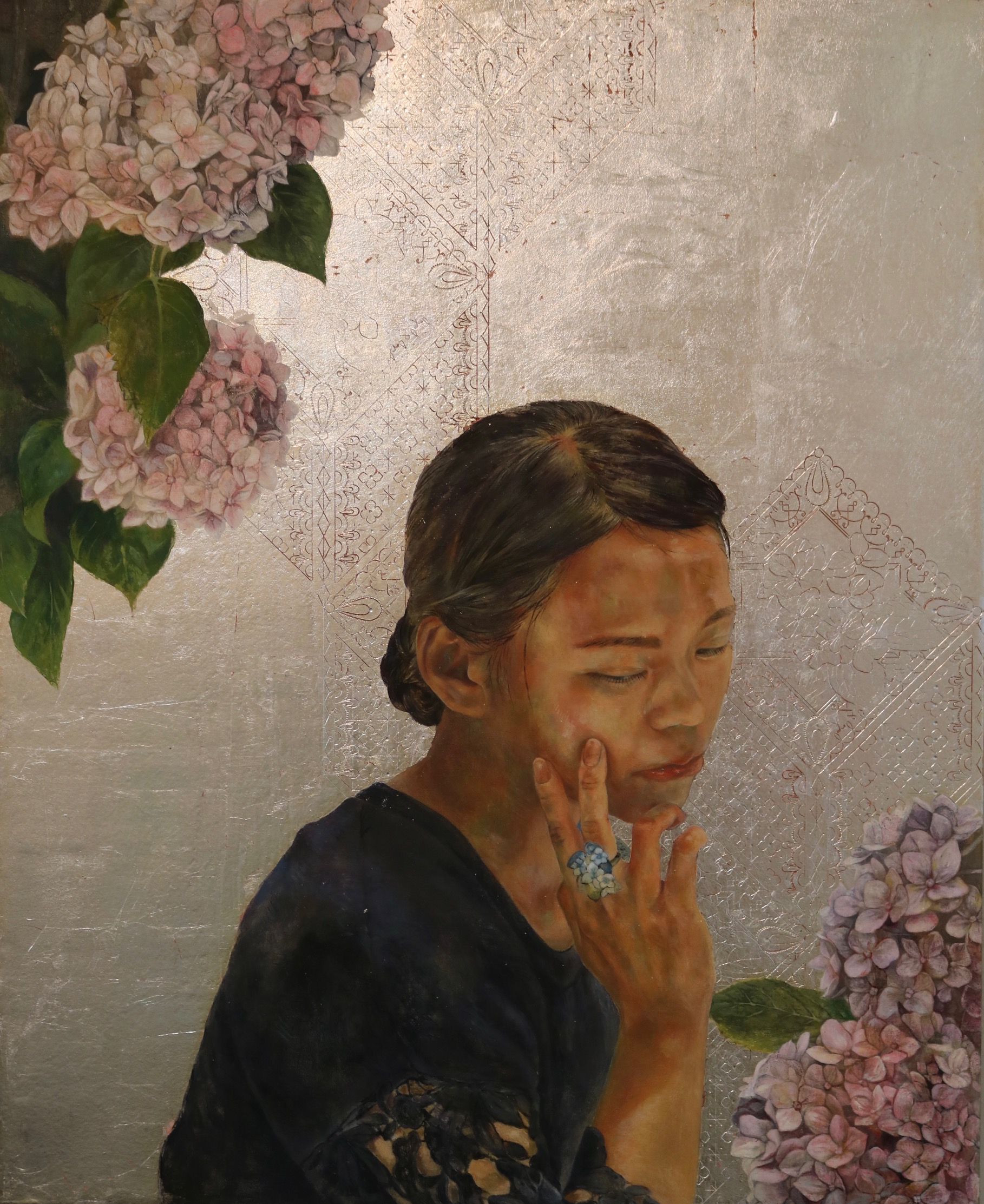 植物と人物を中心に、模様と組み合わせながら空間表現について模索しながら制作しています。日々の変化が目まぐるしい中、静けさを表現できればと思っています。